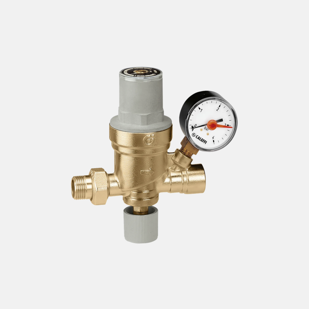 Gruppo di riempimento automatico Caleffi 553640 1/2″ pretarabile con manometro integrato, filtro, rubinetto e valvola di non ritorno. Ideale per mantenere stabile la pressione negli impianti di riscaldamento a circuito chiuso e automatizzare il reintegro dell’acqua quando necessario.