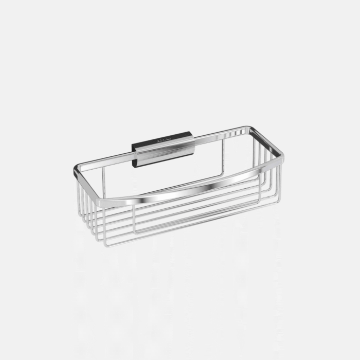 Cestino portaoggetti Inda rettangolare in ottone cromato, sganciabile dalla staffa per una pulizia rapida. Fissaggio a parete con viti e tasselli inclusi. 26×13×8 cm.