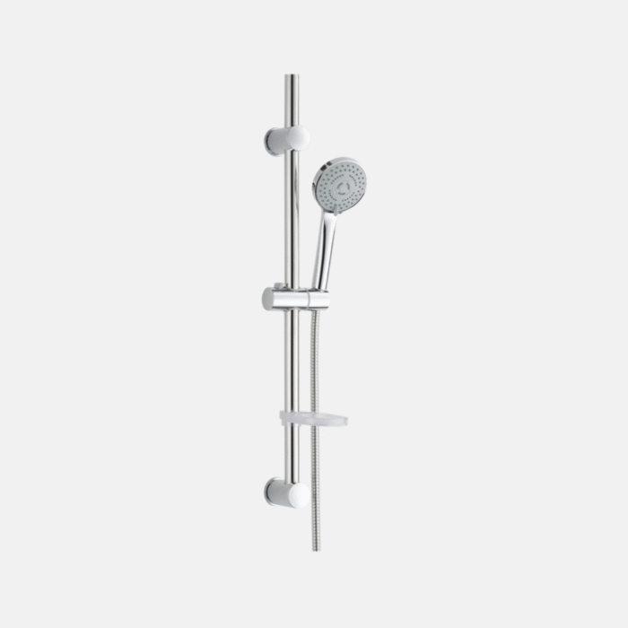 Il set comprende una doccetta multifunzione in ABS cromato con 3 getti selezionabili, un portasapone trasparente comodo e discreto, e un flessibile in acciaio da 150 cm con doppia aggraffatura, per una maggiore durata nel tempo.